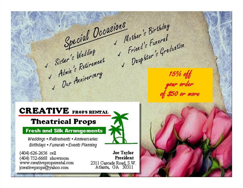 Creative Props Rental was a small business owned by Joe Taylor. It was a full service flower shop with themed decorations, fresh and silk floral arrangements, and theatrical props for any special occasion or event. Joe didn't have any employees and needed help with all aspects of marketing his business.
